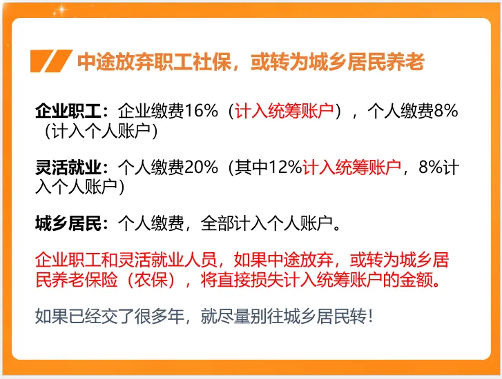 所以,企业职工或灵活就业人员,如果已经缴纳多年职工社保,就尽量坚持交满最低年限,尽量不要转为城乡居民养老保险! |