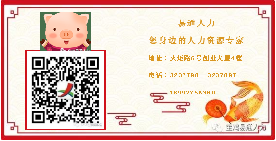 ------阅读,只需一秒。精彩,尽在掌握! 宝鸡易通人力, 为您身边想找工作或正在找工作的人提供更多岗位选择! 为您提供更高水平的人力资源管理服务! 为您提供更多的劳动保障知识援助!